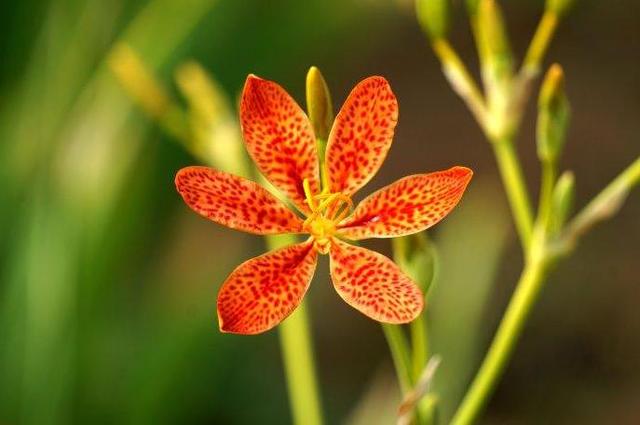 射干花语:个性美,幸福逐渐到来、诚实,相信者的幸福。射干(学名:Belamcanda chinensis (L.)Redouté)为鸢尾科射干属多年生草本。别名:乌扇、乌蒲、夜干、乌翣、乌吹、草姜。根状茎为不规则的块状,斜伸,黄色[详细]